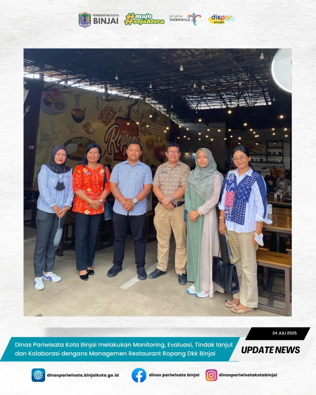 Dinas Pariwisata Kota Binjai melakukan Monitoring, Evaluasi, Tindak lanjut dan Kolaborasi dengan Managemen Rumah Makan Ropang Dkk yang berada di Jl. Insinyur H. Juanda No.8A, Timbang Langkat, Kecamatan Binjai Timur, Kota Binjai, Sumatera Utara, kunjungan ini di sambut langsung oleh Bapak Dedi Setiawan yang merupakan Manager Ropang DKK.