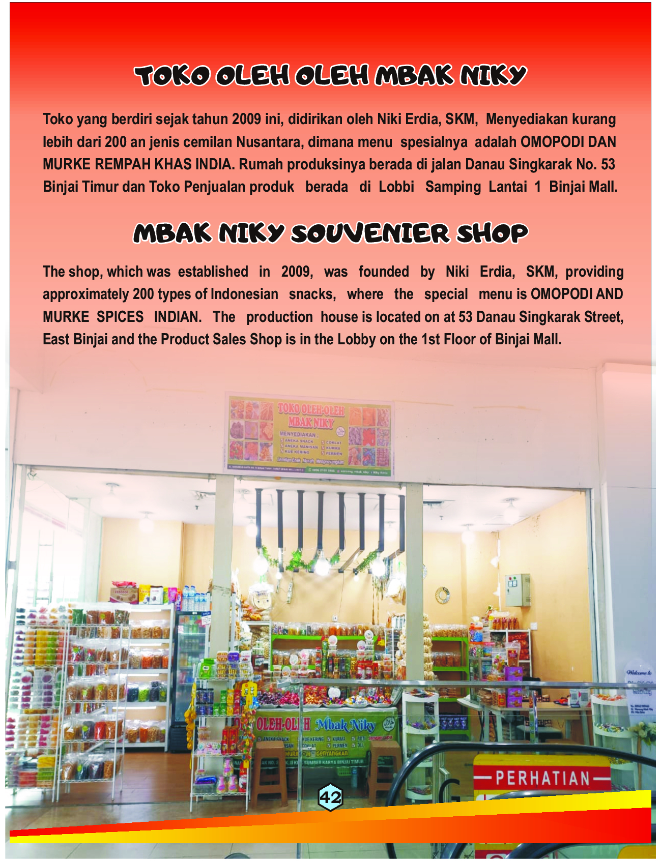 The shop, which was established in 2009, was founded by Niki Erdia, SKM, providing approximately 200 types of Indonesian snacks, where the special menu is OMOPODI AND MURKE SPICES INDIAN. The production house is located on at 53 Danau Singkarak Street, East Binjai and the Product Sales Shop is in the Lobby on the 1st Floor of Binjai Mall.